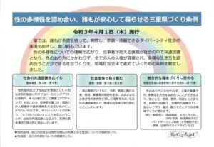 さらに、三重県の「性の多様性を認め合い、誰もが安心して暮らせる三重県づくり条例」の策定にも関わらせていただきました。